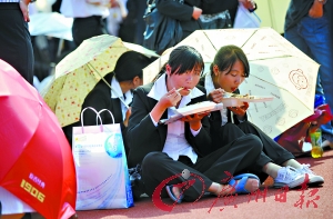 也有同學通過“暗號”聯(lián)系,如“某學院經管班‘最佳射手’請到主席臺”,估計被呼叫的同學是個足球愛好者。也有同學搞惡作劇。當廣播中有同學尋找周杰倫時,全場一陣笑聲。還有這樣的廣播,“麻省理工大學的××同學請到主席臺,您劍橋的同學在等您”,這在緊張的氣氛中制造了難得的笑聲。 文/記者 徐靜 圖/記者 邵權達