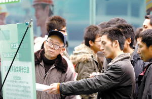 農(nóng)民工專場招聘會,吸引了不少應屆大學畢業(yè)生前來應聘。他們對第一份工作的月薪期望,在1000元左右,與不少有一技之長的農(nóng)民工相比,少了一半。