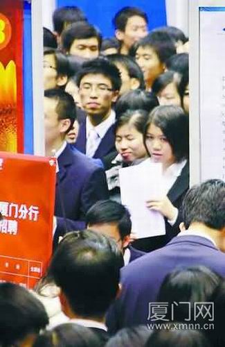 當日在廈大召開的畢業(yè)生招聘會,是廈大每年為自己的畢業(yè)生舉辦的,不過,幾乎省內(nèi)的大學(xué)都有人趕去參加,使得廈大這一年一度的招聘會首次實行門禁——依照人流量分時段放人入場,有的畢業(yè)生花了一小時才遞上一份簡歷。