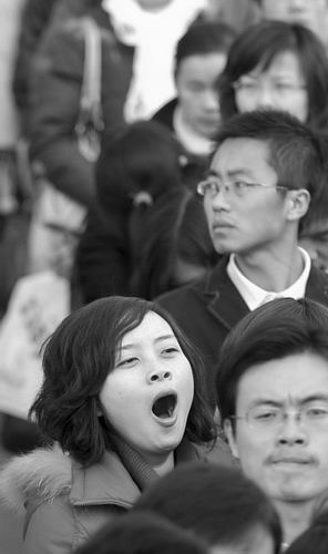 女生一邊等待進(jìn)場一邊打呵欠