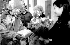 頭戴紅鼻頭鬈發(fā)的小丑面具,身穿一套連體的彩裝寬松衣……昨天下午,當(dāng)手捧鮮花禮品、這身打扮的袁楓和王洪福從威寧路一乘上地鐵二號線,許多乘客還以為又巧遇“雷人”了。其實他們都是大學(xué)生快遞員,正在去送祝?爝f的途中。