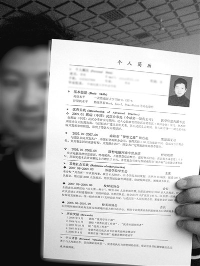 2008年9月至12月,賀歡參加各類招聘會(huì),投出的簡(jiǎn)歷密密麻麻寫滿了他在校內(nèi)外的實(shí)踐經(jīng)歷。但招聘人員大多只看了數(shù)秒鐘就將其簡(jiǎn)歷扔了回來(lái)。有一次,他還親眼看到他的簡(jiǎn)歷被扔進(jìn)垃圾桶。