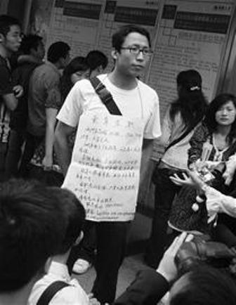4月26日,一位身著淺藍(lán)色T恤、戴著黑邊眼鏡的男青年出現(xiàn)在成都市寧夏街人才市場(chǎng)門口。他的穿著打扮很普通,胸前掛的一塊“賣身求職”的牌子卻十分醒目,引來眾人圍觀。從這塊白紙紅字的牌子上可以得知,這名男子叫王志強(qiáng),今年25歲,身高1.75米,大學(xué)文化。2005年他南下廣東,干過兩年管理工作。由于金融危機(jī),企業(yè)倒閉,所以“現(xiàn)賣身求職,要求年薪至少10萬元。”