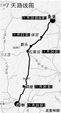 由于沒有買到回老家鄭州的火車票,北航的大二學(xué)生高富松決定騎自行車回家。他1月22日從北京出發(fā),歷時7天抵家,目睹了冰雪對沿途居民的影響。昨天,高富松興奮地告訴記者,雖然路上經(jīng)歷了不少困難,但堅(jiān)持到最后的精神讓自己平安到家,而且這次經(jīng)歷也考驗(yàn)了自己的耐力。