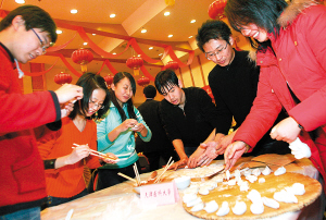 精彩的演出結束后,所有參加活動的學生們一起包餃子。因為不少學生是南方人,包餃子并不在行,餃子的模樣也是五花八門,等餃子煮出來更是皮和餡兒都分了家,大家一邊吃一邊笑,心情很愉快。在南大讀大二的毛靜是個靦腆的重慶姑娘,不愛說話的她也被現場快樂的氣氛感染了,開心地有說有笑,她說,自己家的經濟條件不是很好,又加上下大雪,就沒有回家。自己是個特別內向的人,本來以為會度過一個寂寞的假期,但是,豐富的活動和周圍眾多的朋友讓她感到了家一樣的幸福。