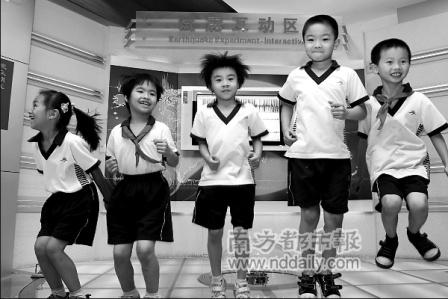省地震科普館“試震互動區(qū)”內,孩子們跳起體驗“震級”。記者姬東攝
