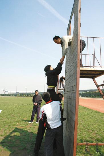 翻越營救墻項目,模擬前有高墻、后有追兵的情境,每個人都必須翻越過3米高的求生墻,大家必須相互協(xié)作,一個先上到墻頂,負(fù)責(zé)拉下面的人,有的還要負(fù)責(zé)擔(dān)當(dāng)“人梯”。