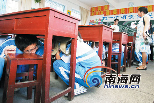 11日下午,海口市地震設(shè)防中心副主任、全國(guó)十佳少先隊(duì)志愿者輔導(dǎo)員何照全向?谝恢谐踔胁康睦蠋焸冞M(jìn)行抗震培訓(xùn),在記者及海南廣播電視臺(tái)音樂(lè)廣播節(jié)目部副主任衛(wèi)華的建議下,何照全隨機(jī)指導(dǎo)初一某班學(xué)生進(jìn)行防震演習(xí)。他先向?qū)W生們講解了防震的基本常識(shí):如果在學(xué)校教室上課,從顛簸與搖晃中斷定是地震,老師應(yīng)立即命令大家不要慌,迅速蹲下來(lái)躲在桌子下,最好再拿書包護(hù)著頭部。待地震停止時(shí),老師立刻組織學(xué)生們有秩序地撤離,到操場(chǎng)上集合。