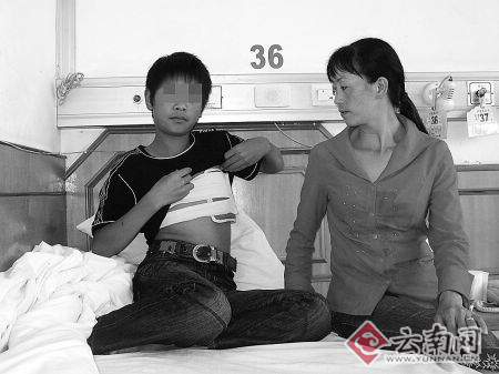 據(jù)阿強(qiáng)回憶,今年6月12日晚,他在文山南鷹學(xué)校內(nèi),因多了一句嘴即被其班主任陳老師痛打。當(dāng)日晚9點(diǎn)多,晚自習(xí)后,阿強(qiáng)和其他同學(xué)一起回宿舍拿洗漱工具到水管處洗臉腳,后按常規(guī)到校內(nèi)一斜坡空地集合接受老師清點(diǎn)人數(shù)時(shí),班主任陳老師宣布還要進(jìn)教室上自習(xí),有幾名學(xué)生因此不滿,阿強(qiáng)也跟著叫了一句:“如果這樣補(bǔ)晚自習(xí)的話,那還不如每天晚上都到12點(diǎn)鐘才睡覺!彪S即遭到陳老師一陣痛打……“我當(dāng)晚睡覺就感到左胸部疼了!”阿強(qiáng)告訴記者:“我被打的第二天,因?qū)W校按常規(guī)放假即回了遠(yuǎn)在西疇的家,回家后也不敢和父母說被老師痛打的事;返回學(xué)校后,我告訴陳老師我被他打的部位還疼,陳老師告訴我要過一段時(shí)間才會(huì)好。”直至6月23日,阿強(qiáng)疼得受不了,才向老師提出要打電話叫母親來接他離校檢查,后經(jīng)同意才得以向家人說出實(shí)情……