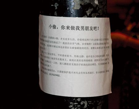 7月14日晚,南寧市朝陽廣場出現(xiàn)了兩張離奇的“征男友”小廣告,小廣告竟公然宣稱“小偷,你來做我男朋友吧”。在張貼小廣告之前,該女子曾在南國早報(bào)網(wǎng)論壇發(fā)帖,公布了她的這一想法,記者也曾與該女孩聯(lián)系,了解她此舉的原因。