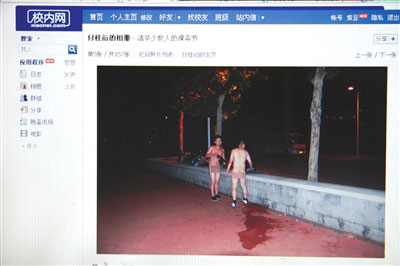 這篇帖子名為《校內(nèi)網(wǎng)上驚現(xiàn)清華紫操裸奔圖》。文中稱,有3名學(xué)生半夜在紫荊操場(chǎng)裸奔,并在校內(nèi)網(wǎng)上傳了照片。據(jù)了解,他們是清華大學(xué)美術(shù)學(xué)院應(yīng)屆畢業(yè)生。記者隨后看到了這組題目是“清華少數(shù)人的裸奔節(jié)”的照片,共50余張。照片內(nèi)的男子均半裸或全裸,做出各種姿勢(shì)。全裸的照片在隱私部位打有馬賽克。