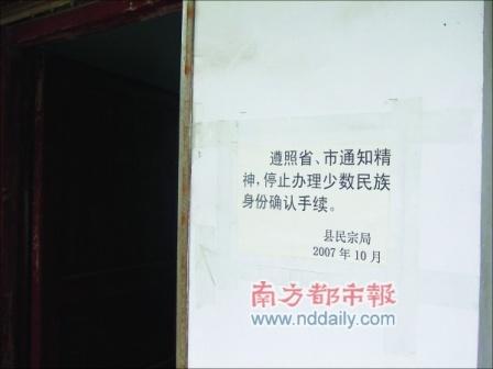 在民宗局辦公室的門口處,張貼著落款為“2007年10月”的一份告示,“遵照省、市通知精神,停止辦理少數(shù)民族身份確認(rèn)手續(xù)。”彭柳說,這是因?yàn)檎宜齻冝k民族變更手續(xù)的人很多,“很煩,就在門口貼了這張公告。”