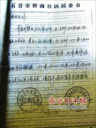 7月18日下午,石首市繡林辦事處槐樹堤居委會辦公室張會計(jì)回憶,2006年7月25日,一名婦女曾找到她,請居委會開具一份證明,這名婦女還找來了一位熟人,以證明她的身份。由于有熟人介紹,她便蓋了公章。