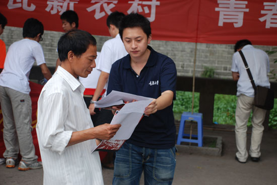 7月14日上午,適逢長沙鎮(zhèn)趕集,開縣團縣委聯(lián)合重慶工程職業(yè)技術(shù)學(xué)院大學(xué)生暑期三下鄉(xiāng)社會實踐團在長沙鎮(zhèn)開展改革開放三十年成就宣講服務(wù)活動。當(dāng)日上午,三十名宣講成員冒著酷暑向過往群眾宣講,宣講活動按思想建設(shè)、國防科技、百年奧運、民主法制、社會民生等10個部分圖文資料生動地展現(xiàn)了祖國改革開放三十年取得的巨大成就。駐足觀看的群眾絡(luò)繹不絕,在展覽前打起了傭堂,他們有的深情凝望圖片資料,有的和大學(xué)生攀談改革開放三十年來自己生活的變遷。