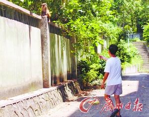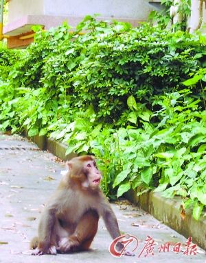 廣東外語外貿(mào)大學(xué)校園東北角是幾棟教工宿舍,隔著圍墻,外面就是郁郁蔥蔥的白云山!按蟾5天前,我看到墻頭上蹲著一只猴子,就回屋拿香蕉過來逗它。它盯著香蕉,又看了我?guī)籽,之后溜下圍墻跳到我身邊,用前爪拍拍我的腿?此蓱z,也多少有點害怕,我把香蕉扔給它,它就自己剝開香蕉吃了!弊≡谶@里的鄭叔告訴記者,這是一只成年猴,個子有70厘米左右,樣子很可憐,一點也不兇!拔以谶@里住了三十多年了,還頭一回看到猴子下山!