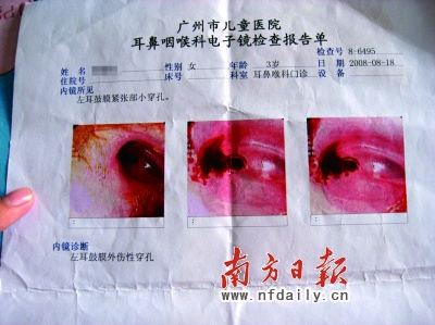 8月18日,何女士帶著耳痛未減的小賢復診,經過電子鏡檢查,診斷為左耳鼓膜外傷性穿孔!袄锩嬉呀浧屏艘粋口,孔里和四周充滿紅色的血漿。醫(yī)生說聽力降低了20-30分貝。”何女士指著化驗單,一臉憂心忡忡。