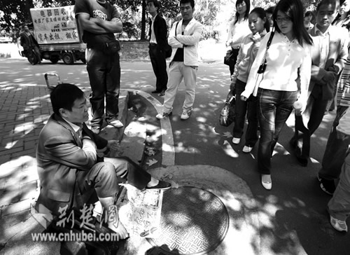 昨日上午10時(shí)許,記者趕到華中師范大學(xué),在距離東門不遠(yuǎn)的一處路口,一名男子在地上擺著一張報(bào)紙,上面用黑筆寫著:“××學(xué)院的×××,養(yǎng)父生病,你如此狠心,不管不問……”,吸引了許多學(xué)生圍觀(如圖)。