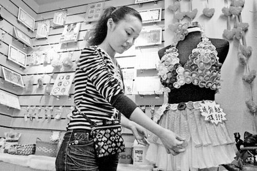 根據(jù)劉女士提供的線索,記者來到沙坪壩三峽廣場這家賣安全套首飾品的小店。該店店面不大,貨架上擺滿了各類用安全套做成的飾品,有手機鏈、棒棒糖、錢包套、筆記本、獲獎證書、刺繡護身符、喜糖等數(shù)十個品種。醒目位置還擺放著一個身上戴著各種安全套飾品的塑料模特。