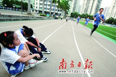 據(jù)氣象部門預(yù)報(bào),深圳昨天晴間多云,東北風(fēng)2級(jí),氣溫24—31℃。下午5時(shí),實(shí)驗(yàn)學(xué)校初中部的250米環(huán)形跑道上,初一(十)班的同學(xué)們正氣喘吁吁地跑步,隊(duì)伍有些稀稀拉拉。幾圈下來,不少學(xué)生的后背已經(jīng)濕透。一些剛跑完的學(xué)生已累得說不出話來,有些干脆一屁股坐在了地上。