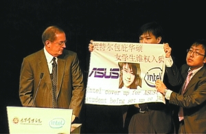 昨日(10月29日,下同),英特爾(Intel)總裁兼CEO歐德寧在北大演講時(shí),華碩天價(jià)索賠案主角之一周成宇忽然沖上臺(tái),舉牌抗議英特爾與華碩聯(lián)合陷害黃靜,隨后被保安架離會(huì)場。周成宇事后稱,此舉是“為黃靜討個(gè)公道”。