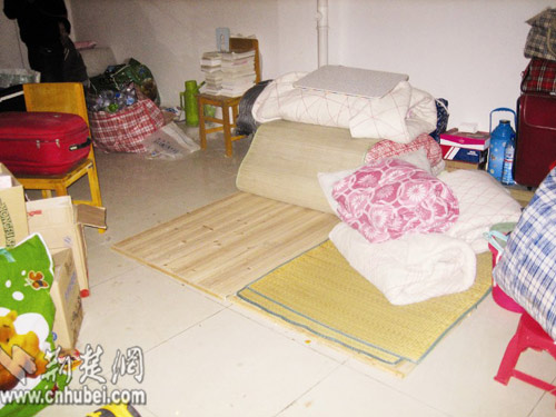 記者程翔報(bào)道:昨晚,湖北經(jīng)濟(jì)學(xué)院眾多學(xué)生因無床可睡,只好打地鋪度過漫漫寒夜!澳憧矗@就是我們的寢室,床都被拆走了!弊蛲7時(shí)30分許,一名女學(xué)生指著一片狼藉的宿舍對記者如是說(如上圖)。據(jù)她介紹,宿舍住的是該校會(huì)計(jì)學(xué)院自考班大二的學(xué)生。大一的時(shí)候,她們住在東湖邊的濱湖校區(qū)。今年9月,學(xué)校下發(fā)通知,稱已在該校大門對面商業(yè)街旁修好了幾棟宿舍,讓她們搬過去。