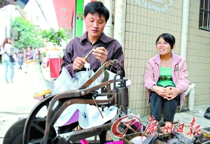 補(bǔ)鞋攤位與房子一街之隔,一張木凳,一臺(tái)機(jī)車(chē),一個(gè)木制工具箱,這就是劉建文的謀生家當(dāng)。如今,年輕的夫婦倆每天坐在街上,妻子幫著拿東西,丈夫忙著修修補(bǔ)補(bǔ),一雙鞋3元錢(qián),一把雨傘2元錢(qián)!艾F(xiàn)在干這行的人多了,一天賺個(gè)40元已經(jīng)很不錯(cuò)。”建文不無(wú)憂慮地表示,“房租230元,兩個(gè)人只有幾百元生活費(fèi),挺難的!