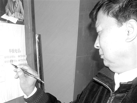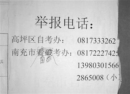 在高坪區(qū)教育局辦公大樓一樓大廳右側(cè),擱了一塊公示欄。公示欄中央,寫著“082次自考公示欄、南充市高坪區(qū)高等教育自學(xué)考試委員會(huì)辦公室”等黃底黑色大字。公示欄上面粘貼的內(nèi)容有四川省第082次自學(xué)考試高坪區(qū)高坪中學(xué)考點(diǎn)二區(qū)考點(diǎn)考場(chǎng)安排表等,在公示欄右側(cè)中央,是舉報(bào)電話及單位:舉報(bào)電話:高坪區(qū)自考辦:0817333××××。南充市看破考辦:0817222××××。為了引起考生注意及顯示自考的嚴(yán)肅性,舉報(bào)電話及單位的字體很大,一目了然。