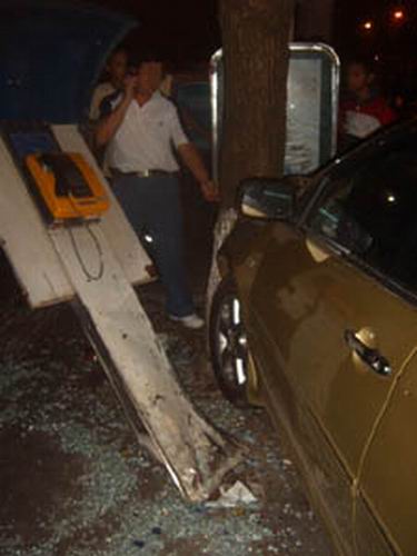 16日下午6時(shí)許,記者趕到車禍現(xiàn)場看到,一輛金黃色豐田車停在瓊山中學(xué)門口右側(cè)人行道上大樹旁,車頭有明顯的撞痕。大樹旁“躺”著一個(gè)公用電話亭,地上到處是玻璃碎片。