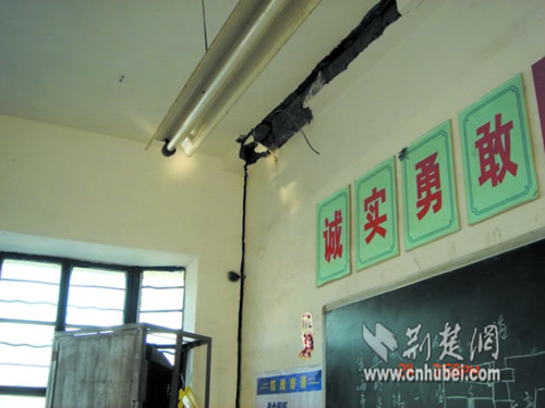 昨日下午,記者在潛江實驗小學(xué)看到,北教學(xué)大樓已經(jīng)人去樓空。有的教室墻壁上的裂縫可以插進(jìn)手掌,有的教室天花板上的涂料全部脫落。