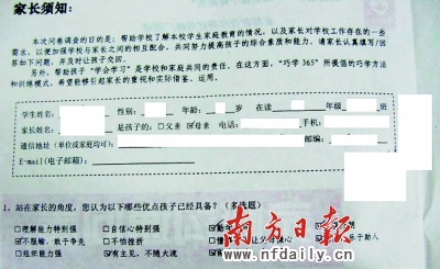 25日,深圳某新聞網(wǎng)站的論壇上出現(xiàn)一則《學(xué)校出賣學(xué)生家長(zhǎng)信息引發(fā)的疑問》的帖子。該帖子稱,就讀深圳南山某名!氨薄粮街小钡募议L(zhǎng),收到學(xué)校派發(fā)一份的“調(diào)查表”:比方孩子學(xué)習(xí)成績(jī)?cè)趺礃影?孩子能自覺完成家庭作業(yè)嗎?孩子與父母的關(guān)系如何等等。雖然這些與中學(xué)生實(shí)際年齡不符的“調(diào)查”,令家長(zhǎng)感到莫名其妙,但見是學(xué)校派發(fā)下來的問卷,家長(zhǎng)們還是認(rèn)真填寫,并按要求寫上家長(zhǎng)姓名,家庭住址,電話(包括手機(jī))號(hào)碼等。此后,就不斷受到“北京華×天驕教育咨詢有限公司”催買《天之驕巧學(xué)365家庭學(xué)習(xí)輔導(dǎo)》的電話。