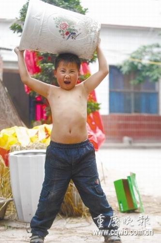 開(kāi)縣有個(gè)6歲男童,他1歲零4個(gè)月時(shí),就提起了5公斤重的東西;5歲時(shí),背起了70多公斤重的母親;現(xiàn)在,更是輕松背起了體重93.5公斤的大人……在當(dāng)?shù),他有個(gè)雅號(hào),叫“小小大力士”。