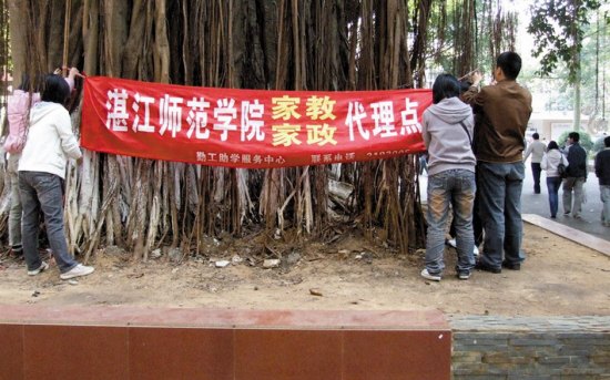 據(jù)了解,湛江師范學(xué)院勤工助學(xué)服務(wù)中心設(shè)有家政部和熱線電話,從周一至周日每天上午到下午,都有學(xué)生干部義務(wù)接聽電話,為雇主提供服務(wù)。而校外也有企業(yè)打出“大學(xué)生家政服務(wù)”牌子招攬業(yè)務(wù)。不過(guò),學(xué)校與企業(yè)的目的不同,前者是為了幫助困難大學(xué)生渡過(guò)難關(guān),而后者則是以贏利為目的。