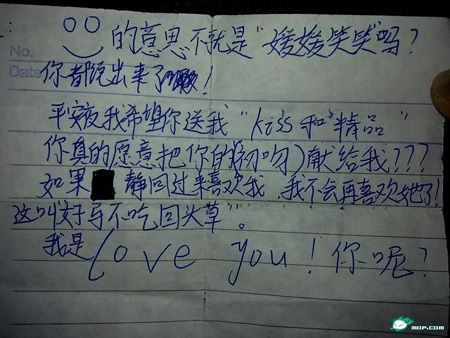 紙條內(nèi)容除了當(dāng)事雙方如此鄭重的表白外,還記錄了一段男生向女生索要初吻的文字,男生希望女生在一個(gè)特定的時(shí)間把“kiss(吻)”送上,他還特別附加問(wèn)一句“你真的愿意把你的(初吻)獻(xiàn)給我嗎?”