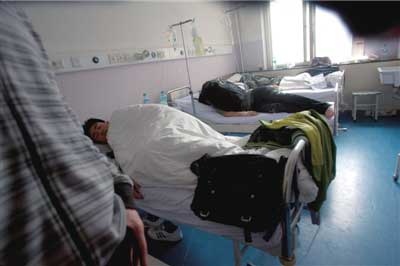 昨天下午1點,在北京市第六醫(yī)院南樓住院部4層,中央戲劇學院的患者分散在3個病房,有近20人。他們打著點滴,躺在病床上,有同學看護,學校老師也不斷查看。醫(yī)院西樓還有部分中戲患者,3人在重癥監(jiān)護室。一患病男生說,他事發(fā)前一天曾吃過學校食堂的三明治。另據(jù)前來探病的女同學說:“幾乎吃了三明治的同學都被送到了醫(yī)院診治!