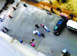 這兩名目擊者說,昨晚6時(shí)20分,一名女生從該樓13層?xùn)|南側(cè)的樓梯窗口墜下,約5分鐘后男生從同樣的位置墜下。墜樓后,兩名學(xué)生橫躺在宿舍樓南側(cè)的地面上,女生穿粉紅色睡衣,男生光著上身,下身穿牛仔褲,身下有大片血跡。記者在47號(hào)公寓樓的 13層樓梯間看到,兩人墜樓的窗臺(tái)高約一米,窗戶的面積不足一平方米,窗戶的紗窗已被撕開,一件藍(lán)色的運(yùn)動(dòng)上衣還留在窗臺(tái)上,附近地面上還有數(shù)根煙頭。而該樓一層?xùn)|側(cè)入口處的欄桿也被砸斷。