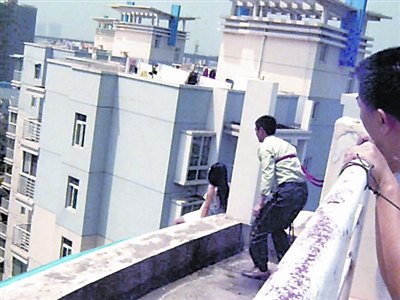上午9時(shí)26分,青山公安分局工人村派出所接警后,值班民警迅速趕到現(xiàn)場(chǎng)發(fā)現(xiàn),一位女孩站在12樓屋檐上欲跳樓,該所民警一邊組織小區(qū)保安疏散樓下圍觀者,一邊跑上房頂與女孩“談判”,穩(wěn)定其情緒。消防官兵則在樓下鋪開(kāi)救生氣墊。