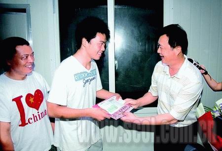 “祝賀你!通過自己的努力即將成為一位民航飛行員,愿你越飛越高!”昨日上午10點(diǎn),當(dāng)身高近1.8米、家住都江堰胥家鎮(zhèn)大林村五組的易爽,用顫抖的雙手從中國民航飛行學(xué)院黨委書記朱勇手中接過裝有自己錄取通知書的信封時(shí),現(xiàn)場閃光燈立刻閃成一片。與通知書同時(shí)遞到易爽手中的還有一束鮮艷的百合花和1000元愛心助學(xué)金。這也是我省08年高考提前批錄取工作正式開始后,由省招辦發(fā)出的第一份高考錄取通知書,而易爽則是我省高考普通類招生第一位拿到大學(xué)錄取通知書的考生。