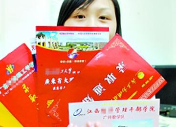 無獨(dú)有偶,在城區(qū)躍龍路44幢居住的梁靜波(化名),不久前竟然和50多歲的爸爸一起收到了來自江西某經(jīng)濟(jì)管理干部學(xué)院的“錄取通知書”!颁浫⊥ㄖ獣鄙系木妥x條件非常誘人,不但可以自選專業(yè),還可實(shí)現(xiàn)專升本,而且百分百包分配,并保證學(xué)生在單位里能得到年終獎(jiǎng)、出國(guó)深造、遷戶口、安排家屬就業(yè)等待遇。
