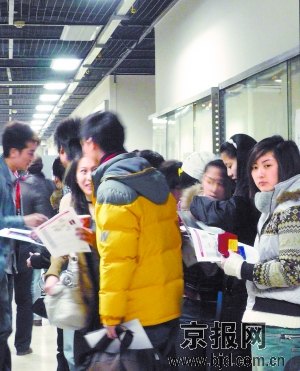 已經(jīng)工作兩年的張琳今天上午趴在電影學(xué)院教學(xué)樓大廳的椅子上認(rèn)真填著報(bào)名表,他準(zhǔn)備報(bào)考電影攝影專業(yè),已經(jīng)在中戲讀大三的弟弟站在他身后為他做報(bào)考指導(dǎo)。