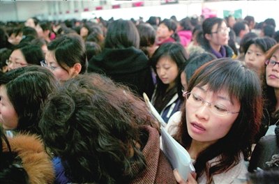 昨天(4日)上午9點(diǎn),女大學(xué)生專場招聘會(huì)在北京市畢業(yè)生就業(yè)市場舉辦。此次招聘會(huì)共有50家企事業(yè)單位參加,600個(gè)崗位提供給前來應(yīng)聘的女大學(xué)生。市人事局畢業(yè)生就業(yè)服務(wù)中心統(tǒng)計(jì),截至下午2點(diǎn)招聘結(jié)束時(shí),約5000人參加招聘,平均8人爭取1個(gè)崗位。