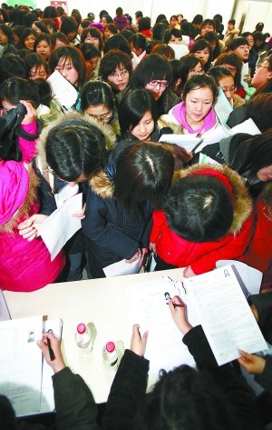 現(xiàn)場(chǎng)50多家用人單位提供的崗位基本都很適合女生,如銷(xiāo)售員、會(huì)計(jì)、文秘、客戶(hù)代表等。但也許是受到性別的約束,盡管崗位有600多個(gè),熱門(mén)單位卻幾乎沒(méi)有。“一份簡(jiǎn)歷都沒(méi)投出去!睂W(xué)刑事執(zhí)行專(zhuān)業(yè)的北京政法職業(yè)學(xué)院的一名應(yīng)屆畢業(yè)生告訴記者,由于所學(xué)專(zhuān)業(yè)窄,除了參加公務(wù)員考試,幾乎每場(chǎng)招聘會(huì)都去,但對(duì)口的單位非常少。