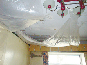昨天,記者在道里區(qū)安道街34號3單元8樓的董先生家看到,臥室的電燈因?yàn)槲蓓斅┧畬?dǎo)致短路,已經(jīng)被迫拆除,屋內(nèi)大部分天棚已經(jīng)被雨水浸濕,墻皮出現(xiàn)脫落。據(jù)介紹,他們的房子是公產(chǎn),1986年進(jìn)戶后出現(xiàn)漏雨,至今15年了,每逢開春屋頂積雪融化時(shí)漏得更為嚴(yán)重,找到房管站也沒有人來管,或者稱由住戶拿材料和人工費(fèi),他們幫忙修。當(dāng)記者找到了負(fù)責(zé)該房產(chǎn)的安隆房管站,工作人員答復(fù):公司不讓他們接受采訪,現(xiàn)在公司也在維修。
