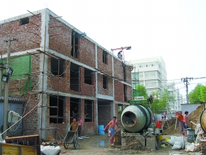 7月17日,記者驅(qū)車來到駝房營村,一進(jìn)村東口,只見一座紅色的3層磚混結(jié)構(gòu)的建筑正在封頂,現(xiàn)場(chǎng)的水泥攪拌機(jī)機(jī)聲隆隆,施工工人進(jìn)進(jìn)出出,樓上樓下一片繁忙的景象。記者發(fā)現(xiàn),施工現(xiàn)場(chǎng)滿地泥水,大批建筑材料堆放在路邊的綠化帶中,成片的草坪、灌木被踩踏、軋壞。