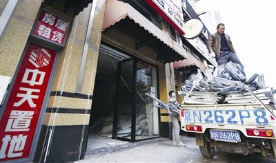 記者發(fā)現(xiàn),這家中介公司已人去樓空。盡管中介公司的牌子依然高掛,但屋內卻破敗不堪,工人正在清理殘余物資。