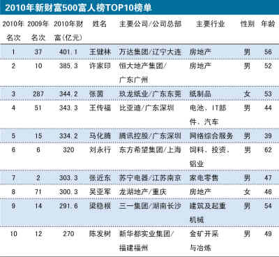 上周末,《新財(cái)富》雜志發(fā)布2010年“新財(cái)富500富人榜”,上榜富人財(cái)富總額為28756.5億元,較2009年增長(zhǎng)76.6%。萬(wàn)達(dá)集團(tuán)王健林以401.1億元位居首富;許家印以385.3億元位列第二;張茵以344.2億元位列第三。