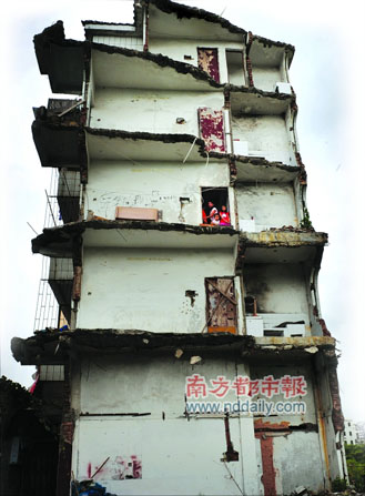在香洲紅山村內(nèi)矗立著一幢很“特別”的四層樓房,一半被完全拆除,一半?yún)s住滿居民。據(jù)屋主稱,該樓房屬兩家合建,去年該樓面臨改建,其中一家與開發(fā)商達(dá)成補(bǔ)償同意拆除,而他們所住的這一方未能談妥,導(dǎo)致出現(xiàn)“半邊樓”。至此,他們已經(jīng)在這里住了一年多了。記者獲悉該開發(fā)商因故停止運(yùn)作,改造項(xiàng)目尚無時(shí)間表。