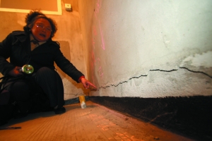 房子周邊的地表下沉,最深處達(dá)12厘米;負(fù)一層衛(wèi)生間靠近地面的墻根處出現(xiàn)長(zhǎng)達(dá)3米的裂縫,最寬處達(dá)1厘米,幾乎橫切整面墻,類(lèi)似的裂縫還出現(xiàn)在房?jī)?nèi)的各個(gè)角落,多達(dá)上百條,僅二樓的陽(yáng)臺(tái)一面外墻上就有七八條;室內(nèi)屋頂、墻角、窗邊,到處都是滲水留下的斑斑污跡……