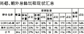 12月6日,SOHO尚都和朝外SOHO的近百名業(yè)主在SOHO尚都3層咖啡廳內(nèi)召開(kāi)了業(yè)主大會(huì),記者了解后得知,這近百名業(yè)主各自擁有SOHO尚都和朝外SOHO的一間到幾間商鋪不等,基本在2006-2007年間收房。據(jù)業(yè)主商小姐介紹,業(yè)主們收房三個(gè)月之后開(kāi)始出現(xiàn)問(wèn)題,因?yàn)樯鈶K淡,租戶(hù)開(kāi)始鬧事,之后新的招商招不上來(lái),出租情況一直很差,目前朝外SOHO基本一半商鋪空置,出租情況最好的SOHO尚都西塔也有35%左右的商鋪空置。