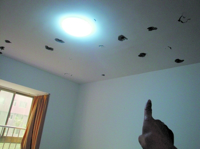 12月7日中午,在物業(yè)公司服務(wù)的王小姐走進(jìn)租住的岳麓區(qū)西岸潤(rùn)澤府小區(qū)6棟307房,立即發(fā)出一聲尖叫,她發(fā)現(xiàn)自己本來(lái)干凈整潔的床鋪上散落著大大小小的水泥塊,而本來(lái)光潔白亮的天花板出現(xiàn)了幾十個(gè)洞!爱(dāng)時(shí)第一感覺(jué)以為是發(fā)生了地震。細(xì)數(shù)發(fā)現(xiàn),竟有29個(gè)洞!焙献獾囊荒泻⒆痈嬖V記者。后來(lái)大家明白了,這是樓上裝修引起的問(wèn)題。