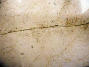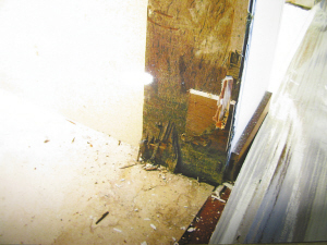 近日,記者來到羅湖寶安南路幸福里樓盤,并隨當(dāng)事人李小姐前往她在小區(qū)3棟某戶的公寓。剛出電梯,一大堆裝修材料便映入眼簾,而房?jī)?nèi)也是一片狼藉一片。在公寓內(nèi)部,堆放著一些拆卸下來的裝修材料及部件,客廳屋頂轉(zhuǎn)角處依稀有滲水的痕跡,衛(wèi)生間及廚房部分的門框都被拆掉。除此之外,當(dāng)事人還向記者指點(diǎn)了多處大理石的裂紋。